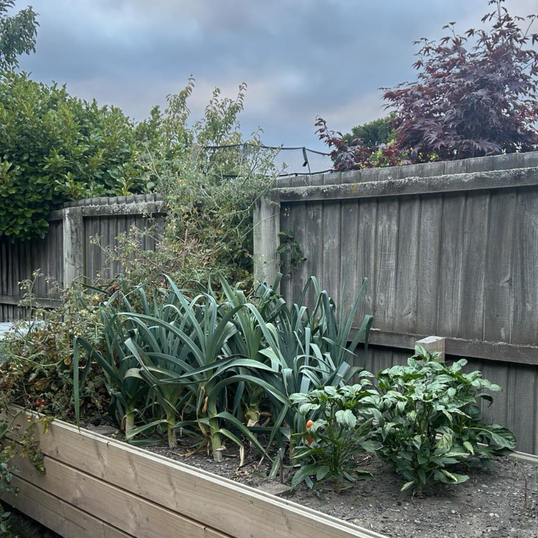 to the right, the tomato has died. to the left, the capsicums are up to fuck all. but in the middle, the leeks hold the line.